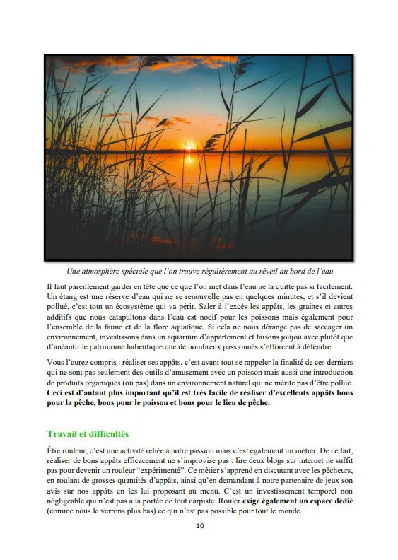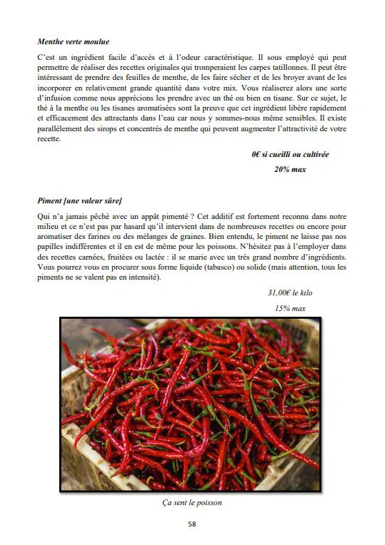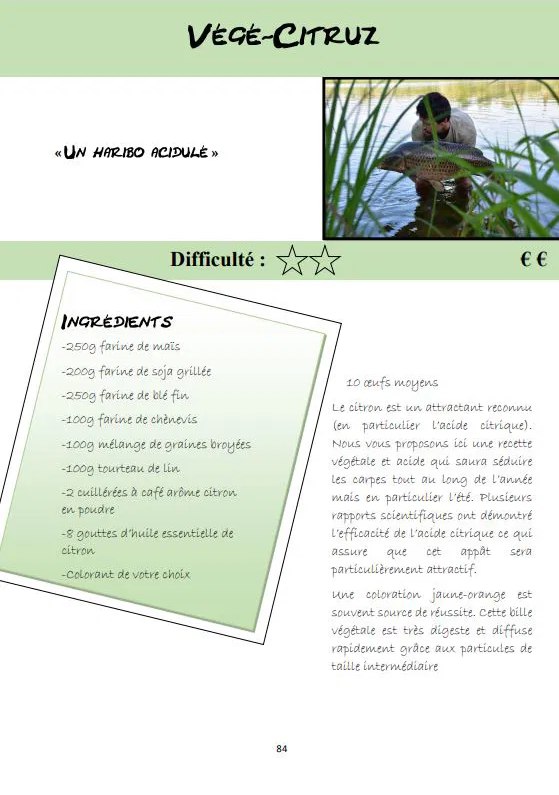 Nous vous présenterons l’ensemble des techniques modernes avec leurs avantages, leurs limites pour vous permettre de vous faire une idée précise du fastidieux travail de rouleur. Plus de 100 pages pour faire le tour du monde de la bouillette de sorte à ce que vous puissiez inventer par vous-même, la bouillette qui vous correspond et qui correspond à vos lieux et techniques de pêche. Accrochez-vous et entrez dans le monde magique de la conception des appâts. Soyez prêt à vous transformer en chef étoilé capable de sublimer les papilles de nos partenaires de jeu pour les faire craquer et les conduire directement sur notre tapis de réception !